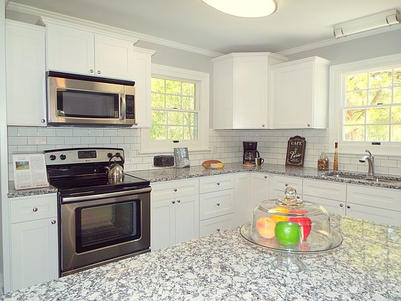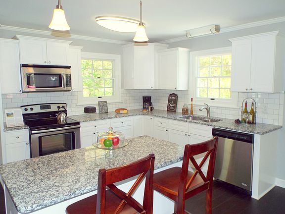 Gorgeous remodeled Brick home in cul-de-sac! Open floor plan. Dream Kitchen with white shaker cabinets, granite countertops, subway back splash, stainless appliances & modern island. Hardwood floors in Kitchen & main living area. Separate den & family room. Large partially finished Basement with wood burning Fireplace. New HVAC & Roof newer. Rocking chair front porch. Large 2 car Garage & parking for 6+ cars. Outside are two decks, big flat back yard & fresh landscaping. Great neighborhood!