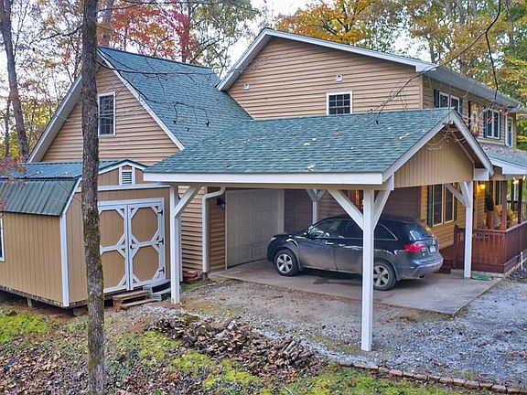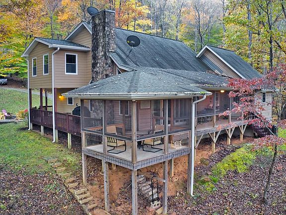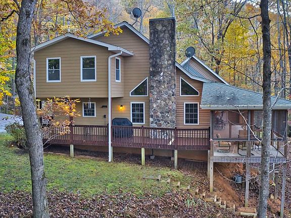 Private wooded setting with a fire pit to enjoy the outdoors on those summer nights. Stepping onto the wrap around porch and through the front door you are in a large farm style eat-in kitchen open all the way thru the living room to the 363 sf porch that is screened in w/ plexiglass along the bottom half. In the living room the beautiful stone gas log fireplace reaches up to the vaulted ceiling and ads warmth to those cool mountain evenings. In the newly remodeled kitchen there are quartz counters, SS appliances, a farm sink and large pantry. Also on the main level are two bedrooms and a full bath. At the top of the stairs is a sitting area overlooking the living room, the master w/ en-suite, a craft room, another full bathroom plus lots of storage. The master en-suite bath is large with wood look tile flooring, large vanity, walk-in shower and laundry area. Also off the master bedroom is a sitting room/ home office/ nursery, you name it. Plenty of parking plus a 2 car carport and 1 car garage.