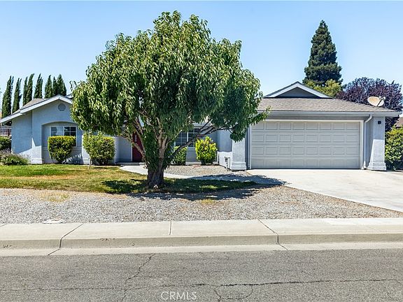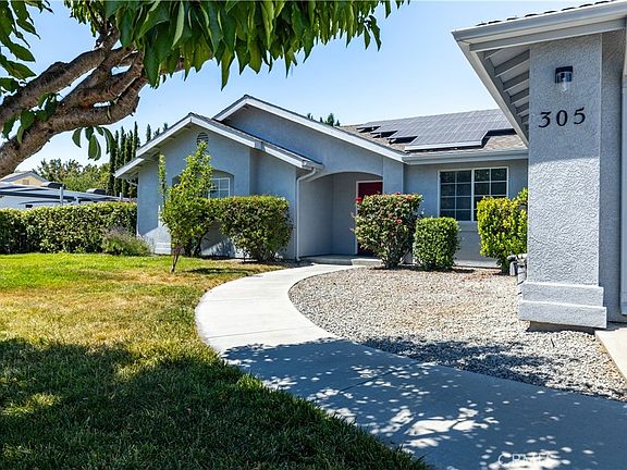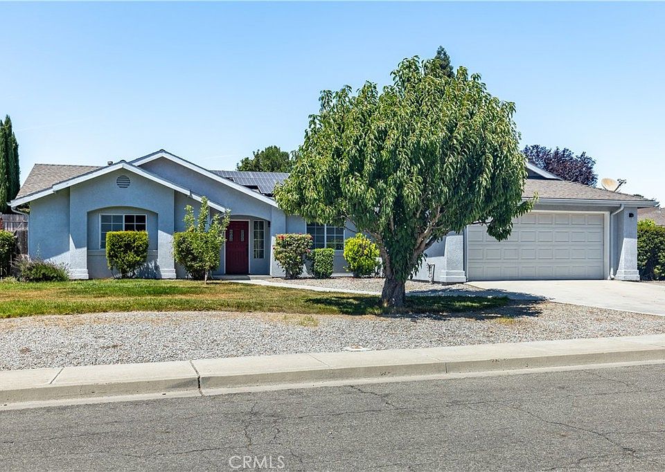 Discover this lovely single-level home featuring 4 bedrooms plus an office and 2 bathrooms, situated on a generous lot complete with a sparkling 30 ft. pool and owned solar panels. Nestled in a well-maintained cul-de-sac, this immaculate residence offers easy access to schools, parks, shopping, and the vibrant downtown square. The bright and airy kitchen is equipped with stainless steel appliances, including a newer range and dishwasher, complemented by tiled counters and a cozy dining nook. The interior of the home boasts a warm and inviting electric fireplace, laminate flooring, fresh paint, updated door hardware, a ceiling fan in the primary bedroom, and a convenient inside laundry room. Step outside to enjoy a beautifully landscaped front yard with pomegranate, apple, and cherry trees, and a backyard adorned with multiple mature grapevines and a two cherry plum trees. Embrace the Paso Robles wine country lifestyle with this exceptional property.