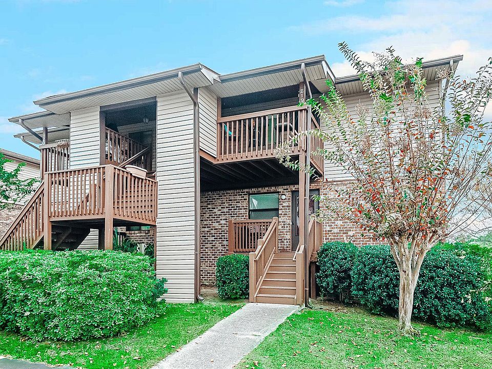 Welcome to Island Green Resort! This beautiful condo Is a end unit with two bedrooms, two full bathrooms.This condo is located on the second floor. You have a relaxing front porch, and as you walk in the front door the first bedroom is on the right and your master is on the left. As you walk down the hall you come to a spacious kitchen with lots of cabinet space and newer appliances, a brand new washer and dryer which is located in the hallway. Laminate flooring starting from the front door running through the hallway and the kitchen. The other rooms have new carpeting and the whole home has been freshly painted. A new HVAC was installed in July 2022 . There is a large screened in back porch attached to two balconies. Lots of outdoor space to enjoy! This community has two outdoor pool and lots of ponds to watch the wildlife. This condo can be rented to both vacation renters and annual tenants. Never have to worry about parking you have two assign parking spots plus extra spots for your guest. You are conveniently located and just minutes to local shopping, restaurant, golf , and the beautiful beaches ..