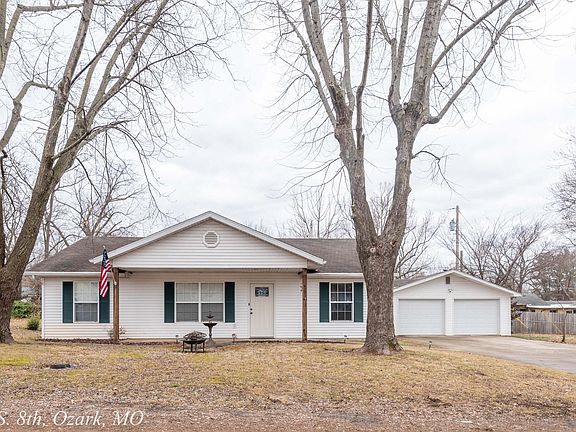 305 S 8th St, Ozark, MO 65721. Super find in Ozark! Inviting, East-facing covered front porch and 2 car detached 24x25 garage. The living room has a raised ceiling & laminate- bamboo flooring. Movie & sports fans will enjoy the projector with 133 inch image and the multi-zone surround sound. Networking/ multimedia is housed within the entry closet. The spacious kitchen/dining has stainless steel appliances that include convection oven, newer dishwasher and refrigerator. New vinyl plank flooring and a built-in pantry complete the modern look. Split bedroom plan. Updates include all LED lighting, newer water heater (2016), washer/dryer hook-up, and PEX plumbing throughout. House is wired for cat-5, cable TV, 1 Gig cable internet or DSL. Close to shopping, schools, restaurants, and doctors.