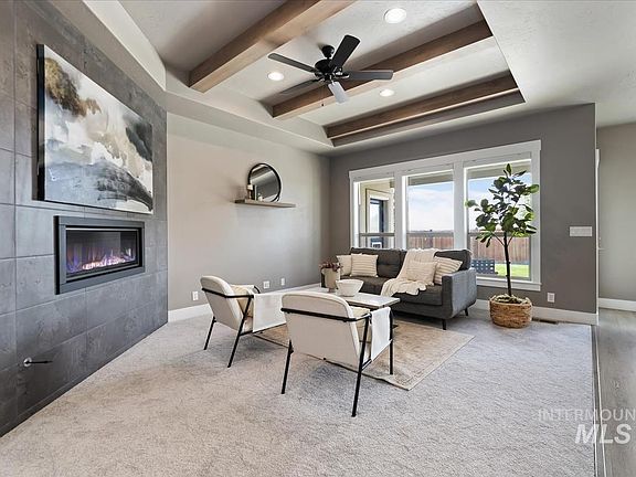 OWNER FINANCING AVAILABLE on this 2021-built, nearly 1900 sq-foot home located in the beautiful gated community of Riverstone boasts modern elegance & numerous upgrades. The open living room features a corner 40" linear fireplace w/ Dove Gray tile. The kitchen is a standout with a full tile backsplash, floating shelves, a 5-burner gas cooktop, built-in microwave & oven, center island & a spacious walk-in pantry. You'll love the relaxing primary suite featuring double sinks, a tile walk-in shower, freestanding tub w/ tiled wall & elegant chandelier lighting. The primary walk-in closet connects to the laundry room for convenience. Enjoy unparalleled privacy w/ mountain & farm views at the end of a tranquil cul-de-sac, ample parking & a stunning backyard perfect for entertaining. The Riverstone community offers an array of amenities, such as a private Beach Club & lake, a luxurious in-ground pool, community center, scenic walking paths, access to the Boise River, tranquil ponds, fire pits & a well-equipped gym.