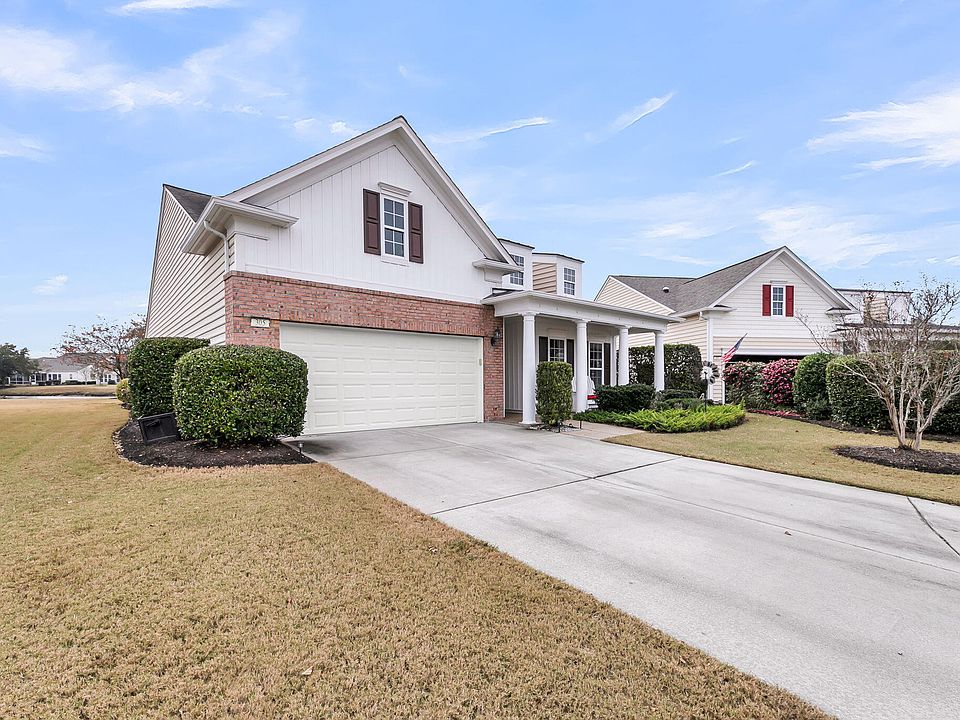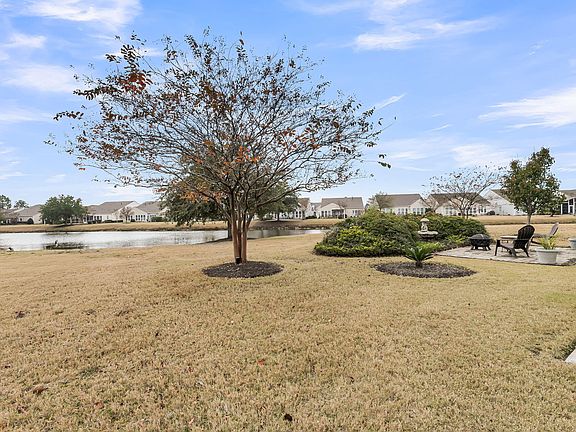 Welcome to this rare pond-front home in an award-winning 55+ community, perfectly nestled on a quiet cul-de-sac with gorgeous water and fountain views from the moment you walk in. The lush landscaping, full front porch, and light-filled interior create an inviting first impression. Beautiful hardwood floors flow from the foyer through the great room, dining area, kitchen, breakfast nook, and sunroom--an ideal open layout for entertaining. The spacious island kitchen offers an abundance of cabinets, granite counters, a gas range, and a side-by-side refrigerator. Walls of windows along the back of the home showcase the stunning pond views from the kitchen, sunroom, and primary bedroom, flooding the space with natural light. The great room features a cozy gas-log fireplace. With 3 bedroomsplus a study/office with French doors and a sunroom, the floorplan provides wonderful flexibility. The two guest rooms are located at the front of the home with their own full bath (tub/shower combo with glass doors), offering privacy from the large primary suite at the back. The primary bedroom includes a tray ceiling, beautiful views, a spacious ensuite with dual-sink vanity, separate tub and shower, and a large walk-in closet. Additional features include a separate laundry room, two-car garage, walk-up attic stairs, and a huge walk-in attic storage room perfect for seasonal items or future expansion. Roof replaced in 2017; HVAC updated in recent years. Located in Del Webb Cane Bay, an exceptional 55+ lifestyle community offering over 100 chartered clubs, a full-time lifestyle director, on-site HOA staff, indoor and outdoor pools, pickleball, tennis, dog park, walking/jogging trails, fitness center, and endless social activities. Live your best life in this beautifully maintained home and vibrant neighborhood!