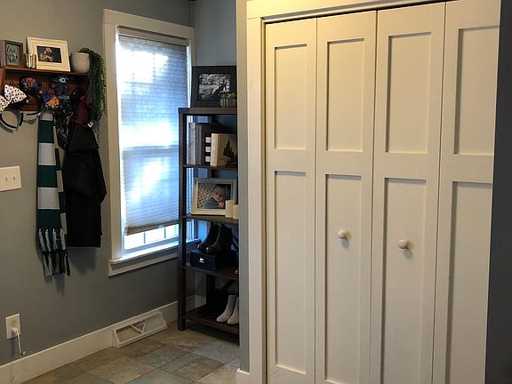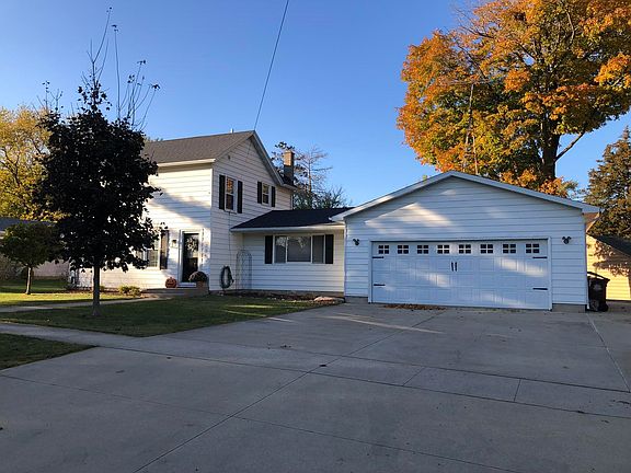 Spacious living room open to the updated kitchen. Kitchen has granite counter tops, tile backsplash, snack bar, soft close drawers, stainless steel appliances, bedroom, full bath and laundry. Upstairs are 2 more bedrooms and a full bath with tile shower. Oversized garage with heat, window air (downstairs now) and a work bench. Concrete pad next to garage for extra parking space, large paver patio, storage shed and triangular shaped lot. Updates include some of exterior painted, back walk in garage door 2022, upstairs bathroom tile shower and floor, upstairs bedroom floors 2019, roof 2015 and kitchen and 1st floor update 2014. Replacement windows (all but the front living room window).