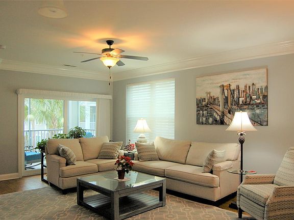 This beautiful sunny corner unit has had many upgrades. Open floor plan with 9 Foot ceilings, hardwood floors, motorized Hunter Douglas custom window blinds, crown moulding, staggered kitchen cabinets with crown moulding and customized drawer pullouts, subway tile backsplash, corian countertops, breakfast bar, ceramic entryway, marble shower in master with sliding glass doors, front storm door, keyless entry, and ceiling fans. Both bathrooms have ceramic tile floors. Screened-in balcony overlooks the huge pool. There is a cabana area and bbqs. Double french door entry into master suite and his and hers closets. Split bedroom plan. Front bedroom has a walk in closet. Large laundry room. There is an additional exterior storage closet. Sellers have annual HVAC contract in place and they come every 6 months. Elevator in building. Close to shopping, highways, and restaurants, and only a few miles to the ocean, this is a great opportunity!
