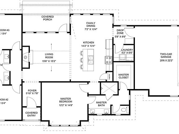The Chelsea floor plan is a three bedroom, two bathroom floor plan that spans across 1,579 square feet. This charming home features an open concept plan, vaulted ceilings and spacious bedrooms. As you enter into the home, the entryway takes you into the living room that has a beautiful fireplace as the focal point of the room. The living room flows into the kitchen that features a large center island. The dining area is surrounded by large windows and leads to the laundry room, drop zone and garage access. On the other side of the kitchen is the primary suite that features a spacious bedroom, large en-suite bathroom with a walk-in tile shower and a spacious primary closet. The second and third bedrooms rest on the other side of the home and share a jack-n-jill bathroom. Off the back of the home is a large covered porch, overlooking the backyard.