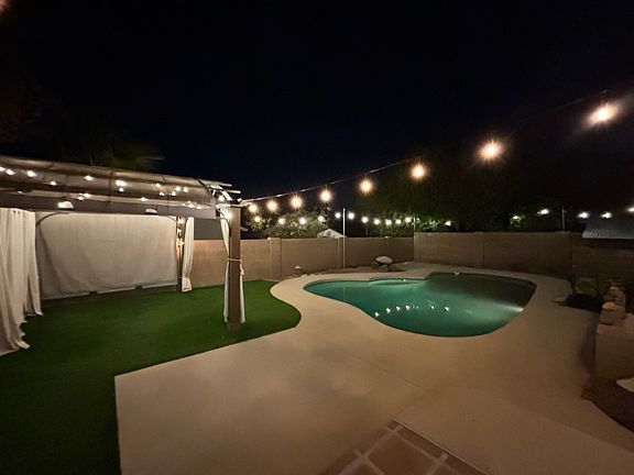 Beautiful 4 bedroom 2 bath home with 3 car garage and a gorgeous sparkling pool in a great neighborhood. Freshly painted throughout with stainless steel appliances, wood flooring and spa like bathrooms. The home is located on a cul de sac with easy walking to public transit and nearby entertainment and shopping. This fantastic well maintained home comes with pool and yard service included, features beautiful green turf grass, a beautiful cedar wood pergola in the backyard, a grill, and a shed for additional storage.