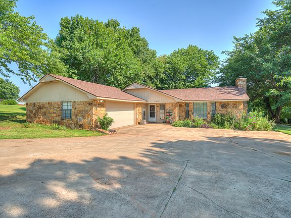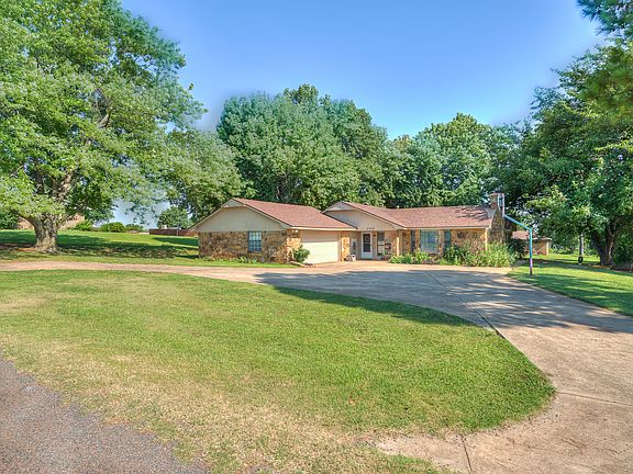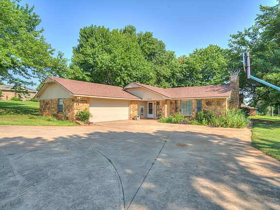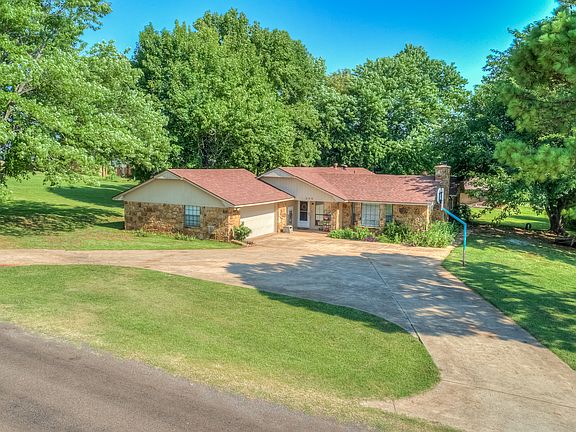 Beautiful stone home w/circle drive in central Washington, claiming 2 lots & approx. .61 acre of land! Walking distance to Elementary school, while lawn & landscapes are easy to maintain! Just off the entry is a sunken living room w/commanding stone fireplace, book-ended by built-ins & updated to impress! Spacious kitchen w/painted woodwork, breakfast bar, pantry, built-in electric cooking & an abundance of counter & cabinet space! Dining room is designed to provide intimate dinner gatherings or entertain a team! Just off the kitchen area are the atrium & half bath! Master retreat includes patio access, dual vanities, hers & hers closets, along with a shower-tub combo! Secondary beds both w/ceiling fans & walk-in or step-in closets! The guest bath is Jack & Jill - almost as impressive as the master! Dual vanities & secluded throne/shower room provide efficiency & quiet the arguments on "who's next"! Come enjoy a gracious spread , central to a treasurable town, in the heart of Oklahoma!