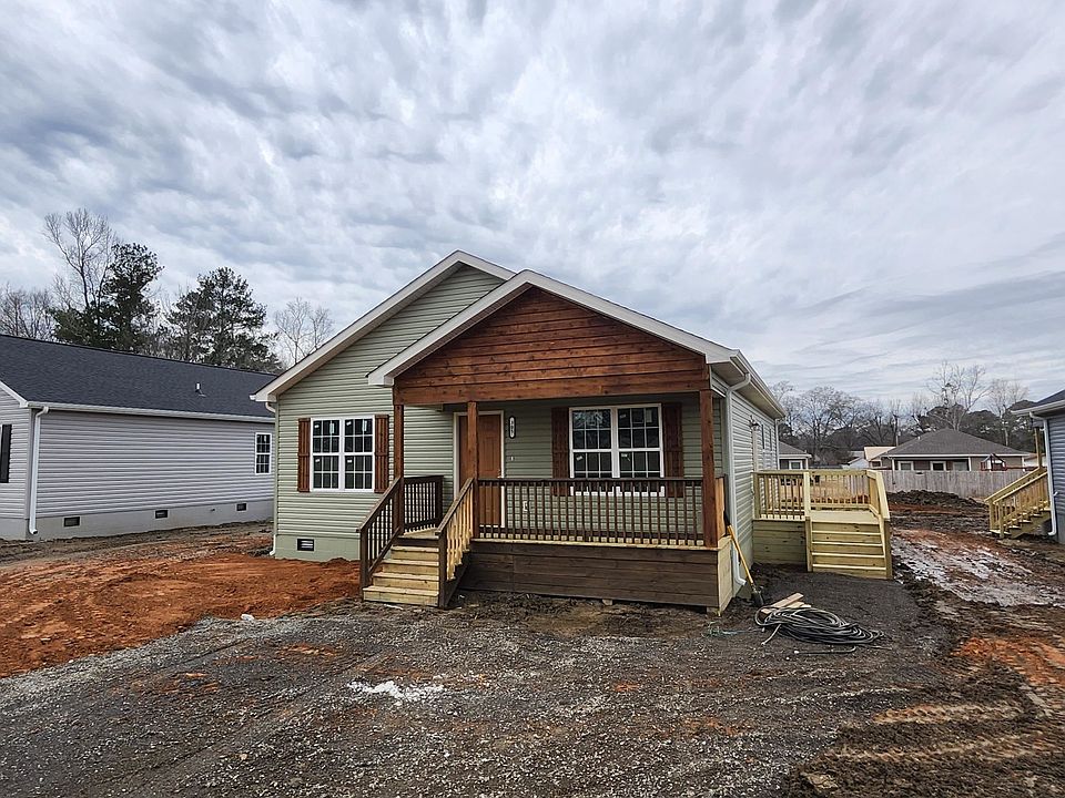 Brand new construction featuring: 3bedrooms 2baths, efficient one level home. Vinyl plank flooring throughout all living areas for easy upkeep. Open living floor plan with living room vaulted ceiling. Kitchen has great counter space for a cooks dream. Large walk in closet in master en suite. Front covered porch as well as side porch off living room. Sodded front yard, full appliance package, ready to move right in. Front yard will be sodded and sides and back seeded in upcoming weeks. Set to be fully ready March 2025.