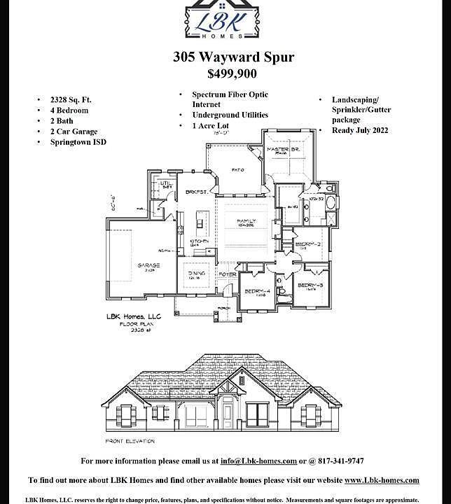 LBK homes has an excellent farm style at the New Bittersweet Subdivision. The HOME SITS ON A ONE ACRE LOT. This home has a warm inviting foyer with an open concept. The center island is accompanied by stainless steel appliances. The Master bedroom comes with separate vanities, a large garden tub, separate shower and a large walk-in closet. Entertain our guests with 2 fireplaces and a large outside patio. AC system is 16 Seers and Fresh Air intake for circulation and efficiency. The perimeter walls are foam insulated to help with energy efficiency. Come see this beautiful home close to nearby Springtown schools. EXTERIOR WITH CEDAR ACCENTS. JULY 2022 COMPLETION. Underground utilities, Nextlink Fiber Optic