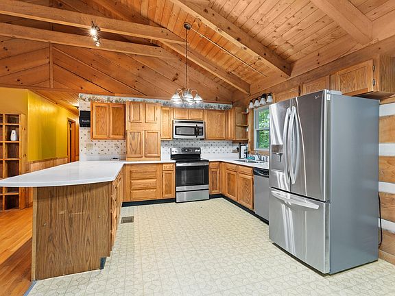 • Beamed Ceilings, Cathedral Ceiling(s), Kitchen Island, Open Floorplan, Solid Surface Counters, Vaulted Ceiling(s), Walk-In Closet(s)