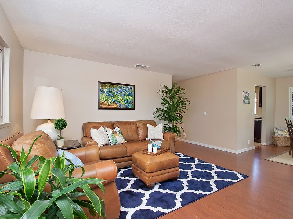 Beautifully renovated 2BR/2BA end-unit with lovely treetop and mountain views from every room. Quiet and peaceful location in the back of the complex bordering the canyon. Remodeled baths, SS appliances, new windows, plantations shutters, ceiling fans, closet organizers, in-unit laundry, A/C and attached garage. Meadowridge is a low density complex with well-maintained grounds, 2 pools, tennis courts and water provided by the HOA. Light and bright unit, with no neighbor above or below, at a very sweet price! Hurry!