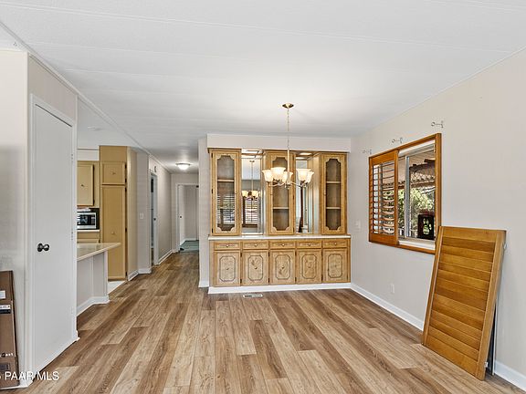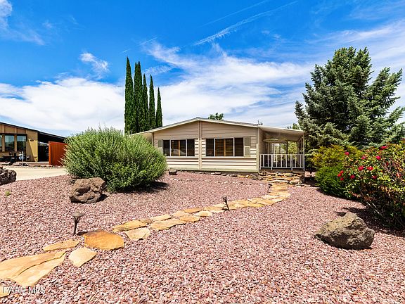 Tucked away at the end of a quiet cul-de-sac, this charming manufactured home has an assumable loan and offers the perfect blend of privacy, convenience, and low-maintenance living. Just minutes from shopping centers, medical offices, hiking trails, and sparkling lakes, the location is ideal for those who want to enjoy the beauty of the Greater Prescott area. Welcome to this low-care landscape and a freshly epoxy-coated driveway that leads to a spacious covered Trex deck, or soak in the luxurious newer spa/hot tub. Step inside to a warm and inviting living room, where there are updated lighting fixtures and plantation shutters. The home has been thoughtfully updated over the years, and it shows, from the fresh paint and modern baseboards to the sleek hardware and finishes throughout.