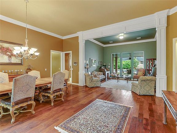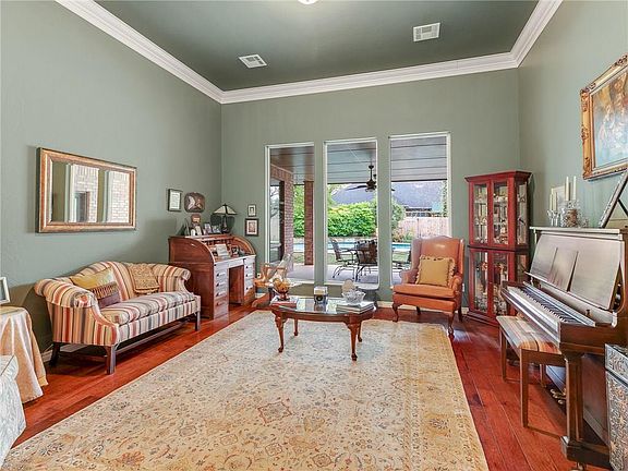 A beautifully kept, traditional home in one of Edmond's most exquisite gated communities-Olde Edmond. Nestled among the trees, this 4 bedroom, 4.5 bath home with lavish landscaping and sparkling pool is perfect for entertaining inside and out. The home design features include an open floor plan with two downstairs living areas, wood flooring, vaulted ceillings, built in bookcases in study, his and her master closets along with new windows, fence and pool heater. Home has split floor plan with all bedrooms downstairs-2 beds on each side. The upstairs bonus room has a full bath and could be used as a media, playroom or 5th bedroom. Your new front porch is waiting!