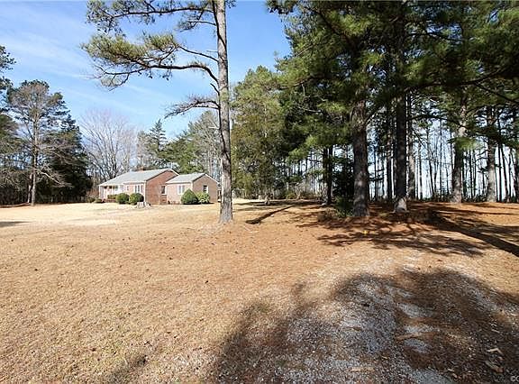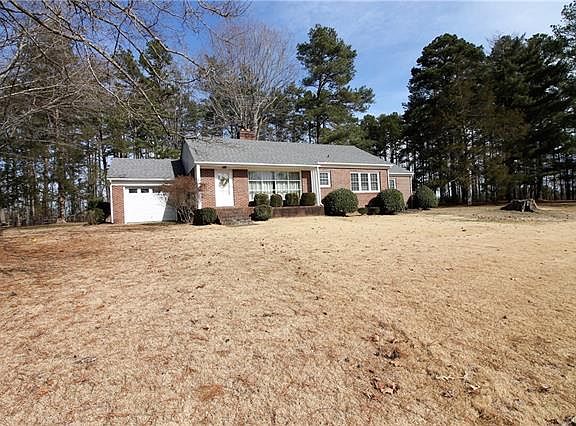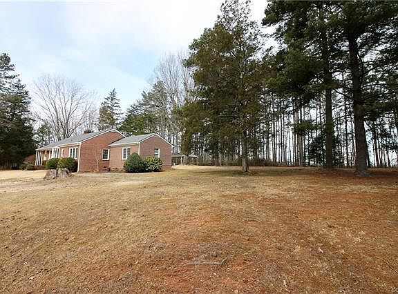 3 bedroom, 2 bathroom ranch situated on 6 semi-cleared acres. Home features beautiful hardwood floors, wood burning fireplace in the living room, and a covered front porch. Gorgeous yard, with one car garage, double carport, walk-down basement with exterior access, and a brick oven for outdoor cooking. Semi-private & flat back yard, perfect for entertaining, gardening, & outdoor activities. Kitchen has plenty of cabinets and an eat-in area, adjoined by a cozy den with built-in bookshelves. 2 additional bedrooms share a full bathroom. This well-maintained home is move-in ready, and offers plenty of character, lots of natural light, and a desirable location. Conveniently between Kenbridge, Victoria, and Blackstone/FASTC and within reasonable driving distance to Richmond and South Hill. Adjoining 86+- acres also available for an additional $169,900. Recent survey of house and 6.22 acres is almost completed. Survey stakes are visible.