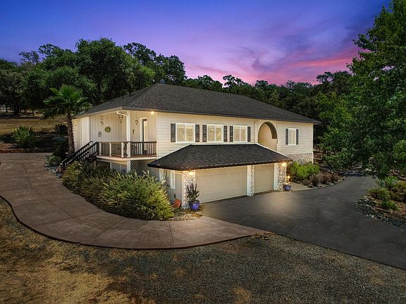 The Perfect Country Estate - Move-in ready and beautifully maintained, this 5.17-acre fully fenced property offers privacy, functionality, and charm. Enjoy the elegance of 4-rail white vinyl fencing with an automatic entrance gate. The spacious home features an XL kitchen with deep pull-out shelves, two pantries (one with a mini fridge), ample counter space, and a 6-burner stove. Warm up by 3 gas fireplaces and relax in 4 full baths plus a bath. The 3-car garage is deep with built-in cabinets. Take in the views from multiple decks. Upgrades include a 1-year-old roof, new A/C, refurbished heater, and a 2-year-new water heater, and a water filtration. 3-stall barn with tack room/shop, 2 fenced pastures, chicken coop, raised garden beds, fruit trees, and a small vineyard. The backyard features a patio, waterfall, hot tub wiring, and side drive-up access. A detached ADU offers 1 bed, 1 bath, living room, Kitchenette, gas fireplace, and large deck. Also includes a fenced dog run, RV hookups, storage shed, and large under-house storage. 2500-gal. water tank and fully paved drive complete the estate.