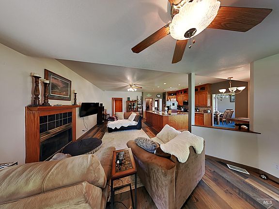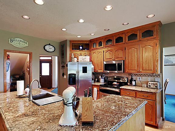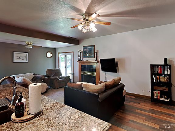 Custom built home on peaceful 5 acres w/ 4 bdrms, 3 full baths, shop/barn & pasture. Located out of the area enough to have privacy, yet close to the freeway for quick drive to Boise city center & easy commute to work, shopping, restaurants & entertainment. Inside features an open kitchen w/ granite island overlooking the greatroom w/ fireplace, a separate living & dining space with pellet stove, a large main level bedroom with full bath and upstairs primary suite w/ double sink vanity, separate jetted tub & walk in shower and a walk in closet. Two add'l bdrms and another full bath are upstairs. There are 3 back doors that open to the grounds that were professionally landscaped & have mature shade trees for quiet outdoor enjoyment & a firepit, fountain & gazebo. The pasture is fully fenced & irrigated. You'll have plenty of parking around the 55'x25' barn/shop, and plenty of space for all your toys, RV and animals. NO HOA, septic and private well. Leave the hustle and bustle behind!