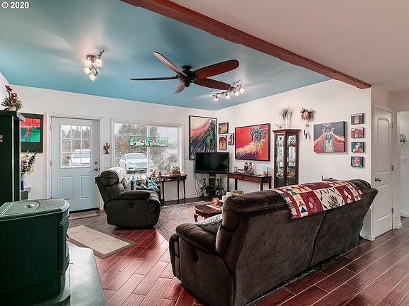 - RoomLivingRoomFeatures: Ceiling Fan(s), Beamed Ceilings, Tile Floor, Wood Stove