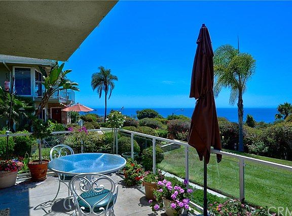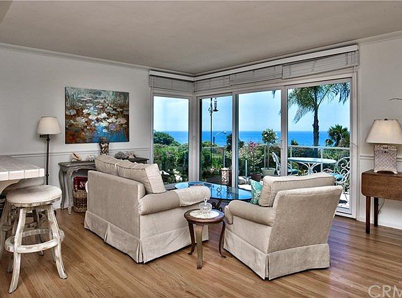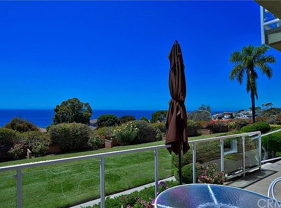 The ultimate beach cottage! Located in picturesque "Upper Victoria Beach". Enjoy magnificent 180 degree, panoramic ocean,sunset & Catalina views throughout this charming home. Single level, ground floor unit, spacious open concept floor plan. 2 large bedrooms & 2 spacious baths. Lovely, bright kitchen with ample storage, breakfast counter that's open to living room and captures the ocean views. Living room looks out to front patio, past the grassy grounds to magnificent panoramic ocean, sunset & Catalina island vistas. Next to dining room is an amazing walk-in China closet. Huge master bedroom has wall to wall closet and private patio that enjoys the same great ocean views. Second bedroom has closet plus built-in desk & bookshelves. Could be great "media center". Beautiful hardwood floors throughout the home add to the immense appeal. Ground level units rarely come on market in "Grandview Terrace". Don't miss this opportunity. A short walk through the quaint underpass takes you to lovely "Victoria Beach". Also walk to grocery store, restaurants, Montage Resort, quaint shops, etc.