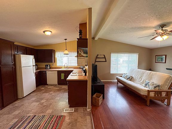 Move in ready 2 bedroom, 2 bath manufactured home on full foundation with earthquake straps. Nice covered patio. 3 storage sheds. Open floor plan with vaulted ceiling. New roof spring 2023.