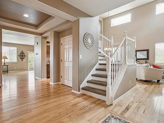 New Price!Great opportunity. Situated at the end of a cul-de-sac, 4 car garage! Bordering open space & walking trail this remarkable home offers a fantastic opportunity for entertaining & enjoying hillside & Castle Rock views. Inside, the home is full of natural light highlighting the hardwood floors throughout main living areas. The spacious layout seamlessly integrates large entertainment areas, including finished walkout basement that is perfect for hosting gatherings. On the main floor, you'll discover a first-floor bedroom w/private bath, flow through living/dining, family room, gas fireplace, & high ceilings. Eat-in kitchen is a haven for culinary enthusiasts, equipped w/stainless appliances, double oven, gas cooktop, considerable granite counter space, center island seating, stained cabinetry, & pantry. Convenient butler's pantry w/sink & extra cabinetry. Upstairs, the owner's suite leaves a lasting impression w/double door entry & retreat-like ambiance. Beautifully appointed, boasting separate shower, jetted tub, his/hers granite vanities, & tiled floors. Generous sized walk-in closet. 3 addit'l bedrooms, each w/its own unique features. 1 bedroom offers a private bath, walk-in closet, & built-in shelves, while another bedroom boasts a private balcony. 3rd bedroom includes a walk-in closet. Addit'l hall bath rounds out the upstairs. The walkout basement provides an excellent space for both amusement & relaxation. Luxury vinyl flooring sets the stage, wet bar area w/refrigerator, & recreation area. Guest suite w/sliding barn door & tastefully appointed ensuite ¾ bath, a media area & speakers. Don't miss hidden storage behind the bookcase. A/C ensures comfort. Backyard w/welcoming patio, deck, soothing water feature. Walking & biking trails, park, pool, & rec center within walking distance, enhancing the community experience. Delightful restaurants, shops, charming cafes, bars, farmers market, stylish boutiques, & grocery stores are all just minutes away.