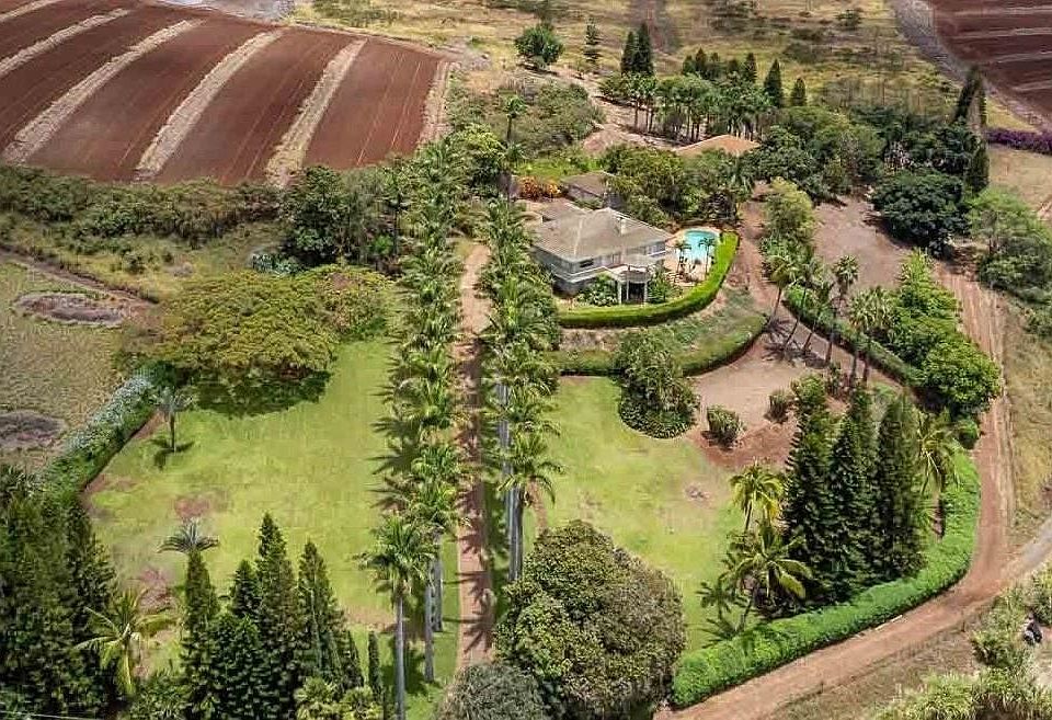 Lower Kula treasure. Set in an ideal drier climate of Omaopio on the lower slopes of Haleakala at approx 1,350 ft elevation, this 4,410 sf home with 5 bedrooms and 5.5 bathrooms on 5 acres of prime Kula ag land offers breathtaking bicoastal views. A spectacular palm-tree lined driveway sets a magical scene for this special Maui property that includes 5-car garage parking, pool & a farm building. From the hilltop garage, the main entry on same level draws you in to the living room, boasting incredible cathedral ceilings, a gourmet kitchen with 6-gas burners, a deck with gazebo that showcases both south & north shore ocean views. The primary bedroom suite, a guest bedroom suite & an office are located upstairs on the same level as the living room & kitchen. Central a/c throughout upper level except for 2nd bedroom. Descend downstairs to find two more bedroom suites, another guest bedroom, all cooled with split-system AC, & a family room with tiki bar that leads to a pool. Downstairs also has the laundry room, another bathroom and storage. All furnishings included with the sale for move-in-ready ease. Ceiling fans throughout. New septic system (1250 gallons) installed in 2017. Priced below recent appraisal. Seller holds active California real estate license.