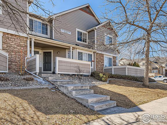 The open floor plan greets you with sunshine streaming in from the multitude of windows, highlighting the recently updated flooring. Make your way into the living room where you can't help but stop and imagine evenings spent cozied up around the gentle roar of the warm fireplace. Next, moving towards the heart of the home- the kitchen. Lined with ample cabinet space and counter space, the kitchen allows you the ultimate setting to unleash your culinary creativity. Enjoy the spacious front patio as you soak up some warm spring and summer sunshine before retreating to one of the two primary suites, ideal for hosting visiting guests or for a roommate configuration. Wonderful storage or future room to expand in the full unfinished basement. Single car detached garage along with additional parking area directly in front of the property.Easy access to nearby open space, lighted paths, Twin Silo Park, Fossil Ridge High School, major retailers, as well as restaurants. Perfect location for the ultimate outdoor relaxation setting with views of the mountain range in the distance, the perfect combination of connectivity and nature!