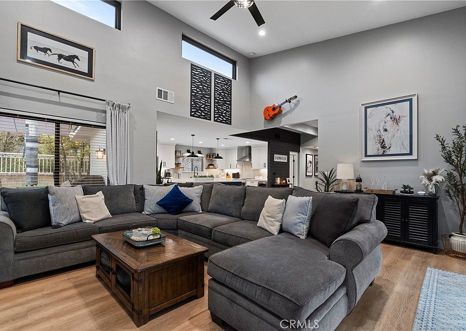 SINGLE story ranch home on the GOLF course with amazing sunset VIEWS almost every single night and a huge, flat POOL SIZED lot with RV potential! Welcome to this exceptionally remodeled 3 bed, 2 bath home featuring a one of a kind detached office/she-shed. This lovely home sits on a sprawling 1/3 of an acre of usable land and is nestled right on the green of the 4th hole of the Canyon Lake Golf Course. With 1,448 square feet of thoughtfully designed living space, this home blends comfort, style and functionality in a prime location. Step inside to an open floor plan with vaulted ceilings and an abundance of natural light through all new windows and doors. The great room flows seamlessly into a stunning modern kitchen, where you'll find a spacious quartz island with counter seating, new beautiful backsplash, custom soft-close cabinetry, stainless steel appliances, a farmhouse sink, updated lighting, wine fridge and a microwave tucked into the island— perfect for entertaining or throwing together some amazing meals with the family. Relax in the cozy living area featuring an elegant fireplace with a custom mantle, vaulted ceilings, lots of windows with great lighting and two huge sliders that look out over your massive backyard, the greenery of the golf course and the mountains beyond. This home showcases fully remodeled bathrooms including a spa-like master bath with a glass-enclosed shower, custom tile work, marble vanity, updated fixtures, new lighting and a sleek barn door for privacy. Additional upgrades include new windows, new doors, new roof, new casing, new trim and fresh paint. The detached versatile shed is equipped with updated floors, lighting shelving, an AC unit and even has an upstairs bunk — ideal for an office, workshop, meditation room or extra storage. This home offers ample parking opportunities and definitely RV potential. Canyon Lake is a distinctive, private gated community designed for golf cart use, featuring a beautiful lake with a ski course, a golf course, extensive hiking, biking, and horse trails, numerous parks and beaches, an elegant community lodge with a restaurant, a remarkable private pool area, sports courts, and much more! Don’t miss your chance to own a slice of paradise in the highly desirable community of Canyon Lake!