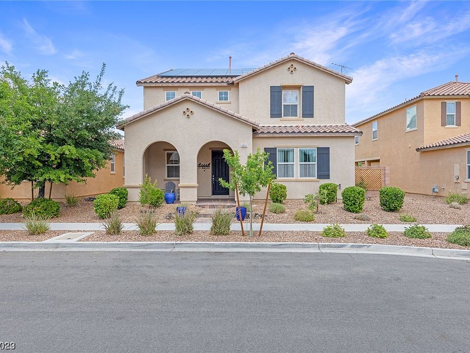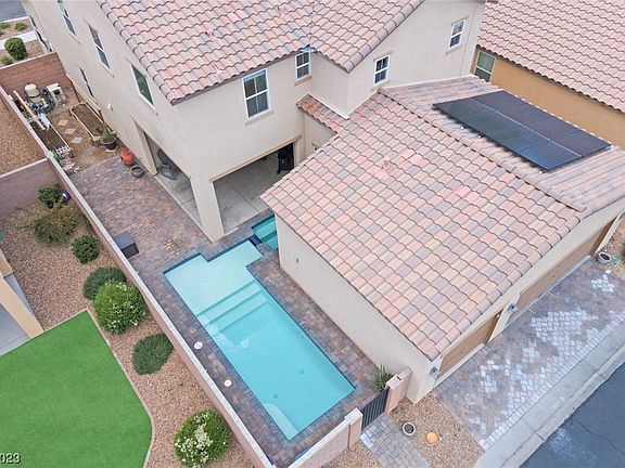 This perfect family home in Inspirada features a heated pool & spa, covered patio, 3 car garage, paid off solar panels, brand new AC/furnace, upgraded laminate flooring & so much more. The front has great curb appeal with a covered porch & well-maintained landscaping. Step into the foyer with high ceilings leading into a huge & open great room/kitchen with abundant natural light. An attached den/office space separates the great room from the garage. The gourmet kitchen features granite countertops, double ovens, new fridge, huge center island, ample cabinet space, & large walk-in pantry. There's also a downstairs guest suite with a bathroom & walk-in closet. The upstairs features a spacious loft & large laundry room separating the primary suite from 3 bedrooms, all with walk-in closets. The primary suite has a large walk-in closet & bathroom with a large soaker tub & shower. The home is located near parks, community pool, dog parks, shopping, dining, schools, & many other amenities.