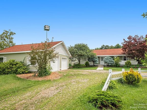 Escape it all at this custom built, stylish home in the country! The interior features an open design with cathedral ceiling which allows for lots of natural light throughout. The updated kitchen with cherry cabinets, stainless appliances, and a large center island with breakfast bar opens to the light-filled great room with wood-burning stone fireplace. Cozy up with a good book in the enclosed sunporch which offers incredible views of the peaceful landscape. Master suite with private bath features a jacuzzi and separate shower while two additional bedrooms share a hall bath. Work from home in the study which could also work as a possible 4th bedroom. Relax this summer on the covered outdoor patio or gather around the firepit to watch the stars...endless opportunities to entertain both inside and out. For the handyperson or artist in your family, the detached 2.5 car garage with attic includes a climate controlled workshop and a storage area. Circular drive makes moving campers, boats and trailers a breeze. This home, situated on 2 acres, is just northeast of Fourmile Lake and only an 8 minute drive to downtown Dexter. Schedule your private showing today!