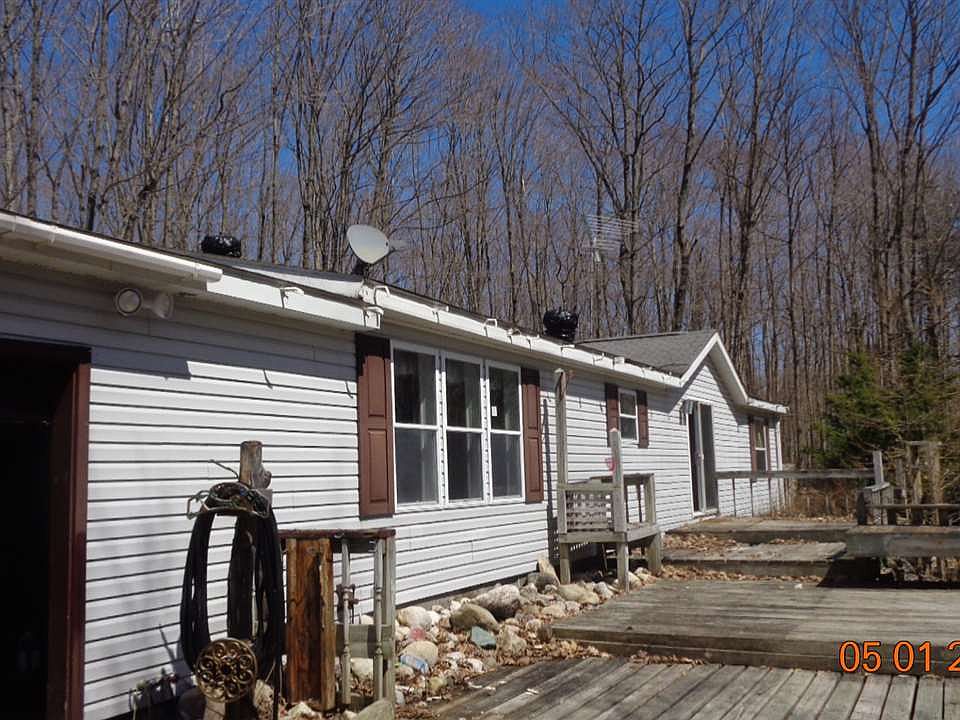 Manufactured home sitting on 40 acres located just outside of town. The property is mostly wooded and has trails cut out of them for walking or ORV. The home does need work and will not qualify for most types of financing. there are several outbuildings as one needs repairs as the roof caved in with the weight of the snow. There is potential there and deer aplenty on the property and being so close to town would be a good project home for the right person or investment property