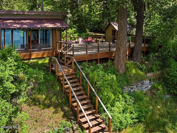 This charming waterfront cabin sits on a 4 acre (mol) compound offering 105 feet of Spirit Lake waterfront. In addition to the cozy cabin there are two additional (dry) bunkhouses providing total sleeping accommodations for up to 8 people. The spacious, shaded 1300 sf. deck and screened porch is perfect for outdoor activities and relaxation. This estate boasts a large dock, and a sports court for pickle ball, volleyball and basketball. Although secluded near the end of a private, dead-end road, the property has great access to the town of Spirit Lake, Coeur d' Alene, Sandpoint, and Spokane. This compound has tons of potential, consisting of a 0.31 acre waterfront parcel, a 2.41 acre secondary waterfront parcel, and a 1.36 acre parcel containing 6 platted lots. The awe-inspiring beauty of the lake with moonlight reflections, spectacular sunsets and views of Mt. Spokane leaves you breathless! One of kind properties. Great boating, fishing and hunting in this area.