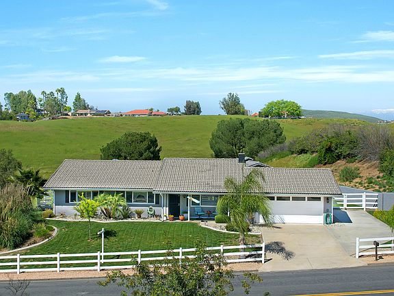 VIEWS, VIEWS and Low Taxes, low HOA, horse property, in the prestigious Meadowview in Temecula. This single story, 3 bed, 2 bath home boasts 1,752 sqft of living space on a 26,136 sqft, 100% usable lot with RV parking and room for a pool. As you enter the home you are greeted by cathedral ceilings appointed with real wood beam, wood fireplace, new energy efficient windows with tons of natural light, new recessed lighting and tile flooring throughout. The open floor plan flows through the great room to the eating nook and large kitchen. The kitchen boasts upgraded tile counters, eat up island, black appliances, tons of storage, white cabinets and has french doors leading the way to the back of the property. The bedrooms are all oversized with brand new carpet, light fixtures and oversized closets. The secondary bath features an upgraded tile vanity to match the tile floors and tub. The master bedroom is large with a huge window, chandelier, his and hers closets, custom bath boasting a dual vanity and brand new glass steam shower with tile to match. The large horse property features plush grass, patio cover, fully fenced, horse corral, area to tie horses for washing, and Mare barn big enough for three horses. There will never be any rear or side neighbor and offers access to the back of the property to trailer your horses. The interior and exterior has newer paint as well as the garage with epoxy flooring. The community features pools, spa, equestrian center and park.