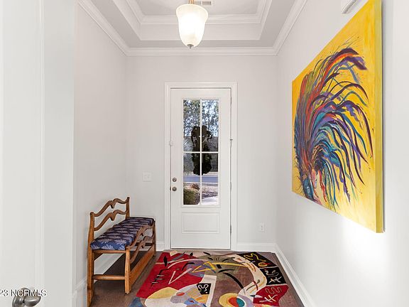 In this home you will find easy breezy feel and timeless touches. Wood flooring is throughout with coordinating ceramic floor tile in the bathrooms. The owners have taken great care of this home and added their own touches, such as installed several glass cabinetry doors in the dining / kitchen area, custom painted murals in the Carolina room, and custom paint throughout the home, even added a variety of appliques to the glass patio doors and shower glass enclosure in the primary bath. High vaulted ceilings, custom ceiling fans and accent lighting cast a modern but coastal feel. The open and airy kitchen is graced with a very large island, Granit countertop, Stainless steel appliances (a double convection oven), large refrigerator and newer microwave.