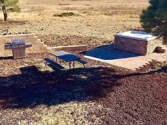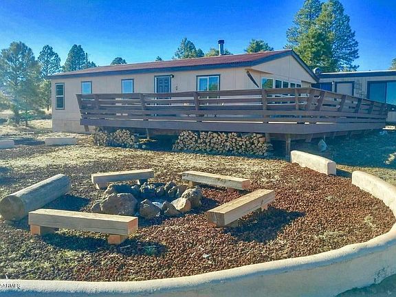 This lovely 8.76 acre parcel borders Forest Service land and has a well and a 5000 gallon cistern. The home has a large open deck, perfect for watching the clouds roll by during the day. Then there is star gazing from the hot tub at night. Roads are maintained and plowed by Coconino County. The mobile is squeaky clean and updated.