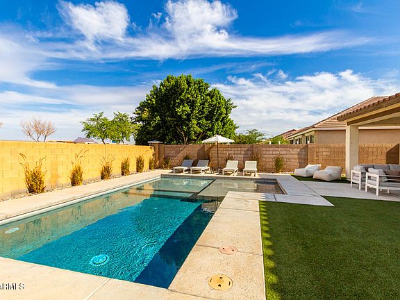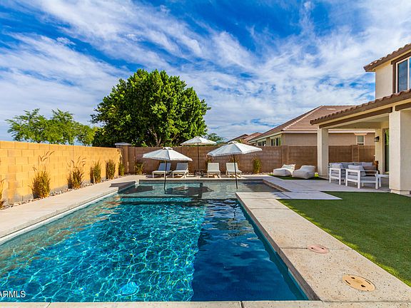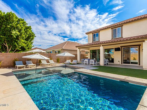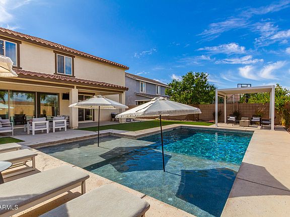 Welcome to this charming two-story home located in the desirable gated community of Lehi Crossing. Featuring a large kitchen island with quartz countertop situated near a wall of floor-to-ceiling sliding doors that open to a backyard oasis with saltwater pool, pergola and low maintenance turf, this home is perfect for entertaining. The downstairs guest room can be used for company or multi-generational living and an upstairs loft offers a versatile space for your family's needs. The air conditioning units, RO system, and salt cell for pool have recently been replaced. This home is conveniently located to freeway access and near community parks and walking paths.