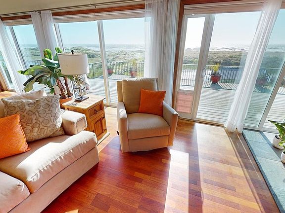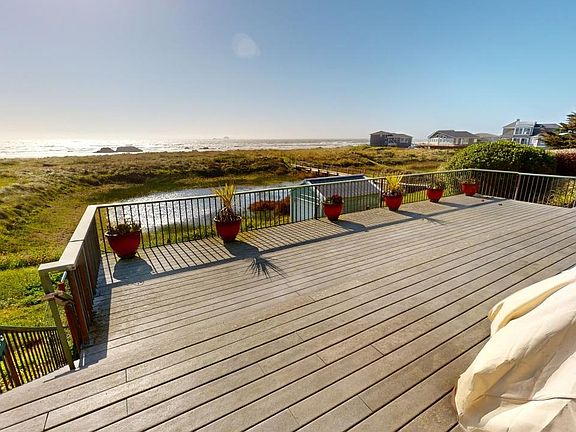 Experience coastal luxury living at its finest with this exquisite custom-built 3-bedroom, 2 and a half bath oceanfront home on almost an acre of prime real estate. Embrace the tranquility of your surroundings as you gaze upon the seasonal pond and revel in breathtaking ocean views from nearly every room. The heart of the home boasts a gourmet kitchen adorned with granite counters, an expansive island featuring a prep sink, and cabinetry equipped with convenient slide-outs. Both the family room and living room offer spaces for relaxation and socializing. Step outside onto the sprawling deck and follow the path leading directly to the beach, where endless adventures await. Ample storage options abound with two single-car garages, a garage workshop shop area with attached greenhouse, and a 14x35 boat/RV storage shop facility complete with insulation. Additional amenities include a rejuvenating hot tub, 8x12 tool shed and dog run. Indulge in unforgettable sunsets and leisurely beach walks, crafting cherished memories in this coastal paradise.