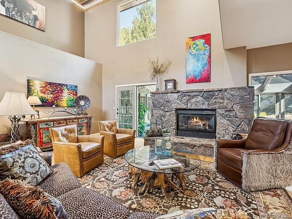 Nestled within the historic gated community of Troutdale in the Pines this mountain contemporary seamlessly blends luxury mountain living with small-town charm. Enjoy rare access to a private stretch of Bear Creek with fishing rights as well as a short walk to nearby hiking trails. Inside, discover a refined interior highlighted by a grand great room with twentytwo foot beetle kill-pine ceilings and recessed smart LED lighting. Main level’s primary bedroom with fireplace creates a sense of tranquility and ambience. Also recently redesigned is the ensuite 5 pc bathroom featuring heated floors including the walk-in shower, soaking tub, heated bidet, double sinks, and stunning quartzite countertops. The main floor continues with the office/2nd bedroom, great room with designated dining area, gourmet kitchen with adjacent TV room, and year round sunroom with a large wall of windows. The well-appointed kitchen showcases Viking stainless-steel refrigerator, a 6-burner gas stove, dual Miele dishwashers, and walk-in pantry. Upstairs, one of the three bedrooms is ensuite and the other guest rooms share a Jack-n-Jill. Finishing this upper level is a multi-purpose loft. Tall ceilings continue on the lower level walk-out featuring a wet bar, custom stone countertops, full size refrigerator, a 130 bottle wine cooler, ice maker and sink. Guest bedroom is presently used as an exercise room adjacent to a wheelchair adaptable bathroom with walk-in shower. Lots of room for all types of entertainment including a built-in TV entertainment center appointed with stone finishes. Easy access to enjoy your very own outside private patio. Don’t forget your secluded backyard oasis just off the main level sunroom complete with custom pavers, water feature, sunken gas fire pit, irrigated flower beds, stunning rock outcroppings and mature trees. This SMART home has too many special features to mention, please call for a full list of details. Conveniently located to all the needed amenities.