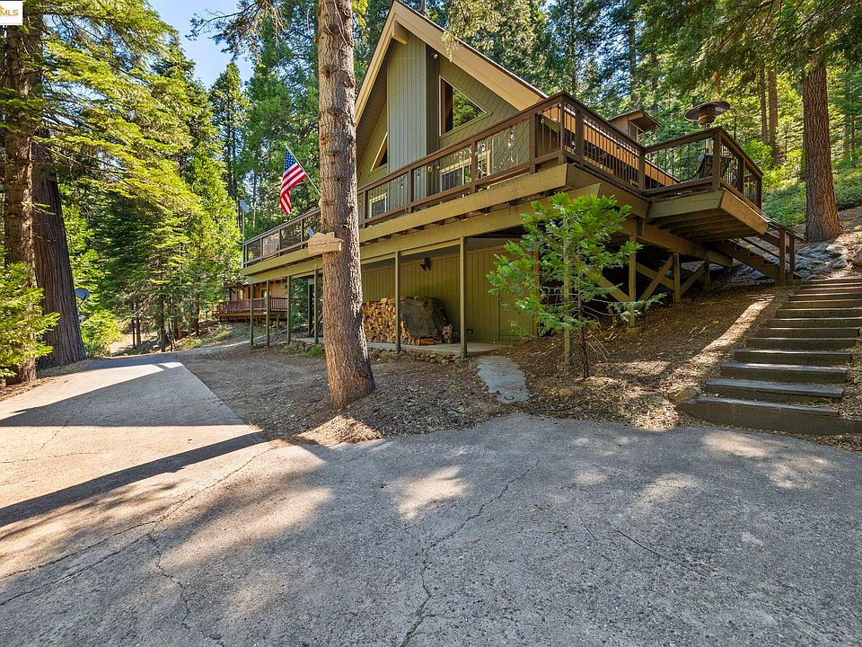 Fantastic location in Strawberry Ridge that backs up to a wooded forest of private acreage with no neighbors behind you. This 5 Bedroom chalet style cabin will impress you with its expansive wrap around deck to soak in all of nature's wonder! Large open great room with open beam and knotty pine ceiling, along with the rustic charm of the wood shingle siding provide the perfect cabin ambience. Main level kitchen has line of sight into great room and a full size pantry closet with additional refrigerator offer plenty of storage. Two bedrooms, laundry room and full bathroom on the main level and 3 bedrooms, open loft family room and a full bathroom complete the upper level. Plenty of storage underneath, shared circular driveway and dedicated parking area. Easy access to Hwy 108 for seasonal recreation at Pinecrest Lake, Dodge Ridge Ski Resort, Leland Snowplay and so much more. Short drive to local stores for groceries, dining out or gas for you car and coming soon to Cold Springs, a Tesla charging station. Ready to make new memories and fully furnished makes this a MUST SEE cabin!