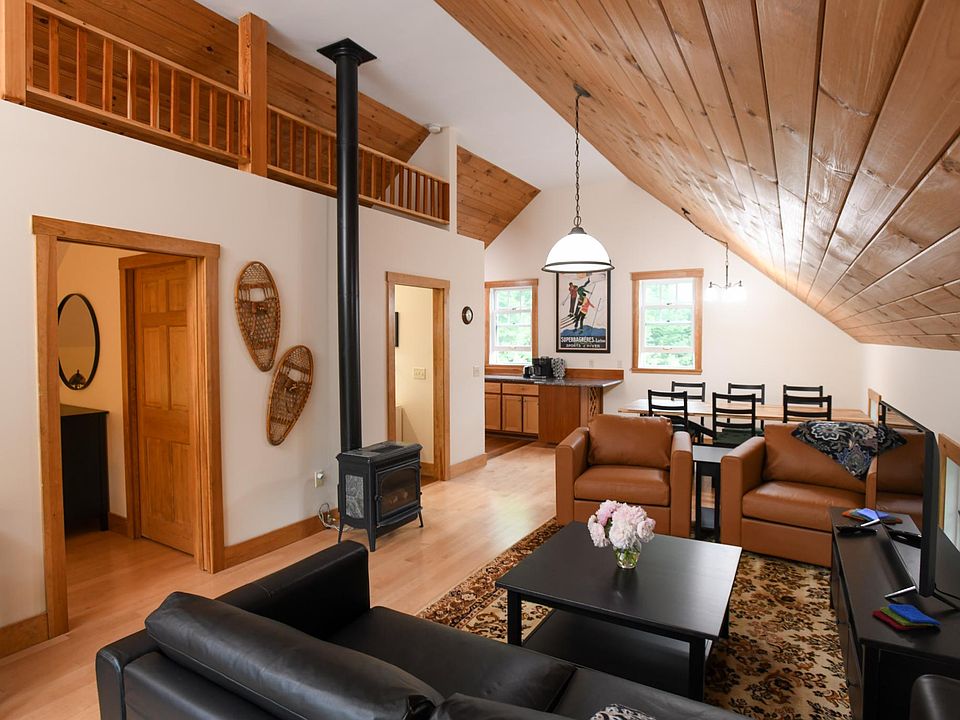 Beautiful, private, fully furnished, one-bedroom apartment for lease. 10 minutes from Sugarbush's Lincoln Peak, and five minutes from Waitsfield and Warren villages. Beautiful Mad River Valley E Warren Road location. Listen to the Folsom Brook and look at mountain and garden views from your private porch. This exclusive apartment sits off by itself with a separate entrance and two-car parking. Perfect ambiance with a freestanding Hearthstone gas stove, vaulted natural wood ceilings, open floor plan with maple and cherry floors, and newly furnished with leather and natural wood. Property includes a trail network along the year-round brook and beautiful pond. Experience luxury accommodations just minutes from skiing, snowshoeing, hiking, mountain biking trails, scenic road biking, restaurants, and one of the best farmers markets in Vermont. Modern fully-equipped kitchen with granite counters, new refrigerator, microwave, etc., exterior enclosed 3x6 storage closet, new in-unit washer & dryer, TV, high-speed fiber internet, and so much more! No pets, please. One-year lease. Renter pays for propane and electricity. This is a one-year lease, with security deposit due at signing.