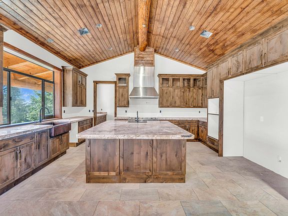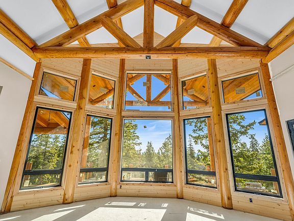 The great room is a centerpiece of comfort and style, featuring a wood-burning fireplace with a natural stone cover, a large log mantle, and a stone hearth. A custom wet bar, fabricated from log truss matching hand-scraped logs from Montana, includes a hammered copper sink, an oil-rubbed bronze faucet, and a granite countertop. The dining room, set in a large bay window, accommodates 12 or more guests, with a 22 ft log truss ceiling overhead and a full vaulted ceiling wall of black dual-pane windows.