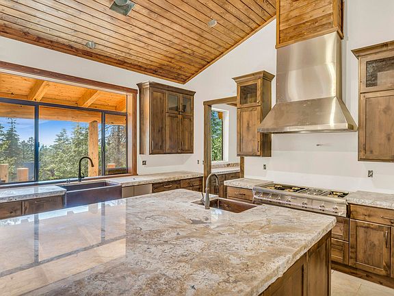 Inside, a curved sweeping wide stairway with... 3-inch thick hand-scraped treads leads to the upper living area. The expansive living space includes a hand-hewn log bar with a sink, a rock-covered wood-burning fireplace, and a kitchen appointed with designer Thermador stainless appliances. The kitchen boasts a Thermador 6-burner range top, a large center-mounted hammered copper sink, and a second hammered copper sink in the island. Shaker-style stained doors and drawers with European full extension guides and soft close, along with full-height cabinets, complete the elegant kitchen design.