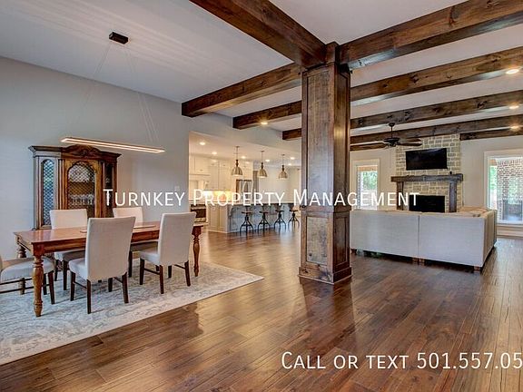 This impressive 3793 sq. ft. home in Little Rock, Arkansas offers a blend of comfort and style across two floors. The main level spans 2930 sq. ft. and features an open-concept living area that seamlessly combines the kitchen, dining, and living spaces. The gourmet kitchen boasts white cabinetry, stainless steel appliances, and a large island with seating. A stone fireplace serves as a focal point in the living room, complemented by hardwood floors and large windows that flood the space with natural light.