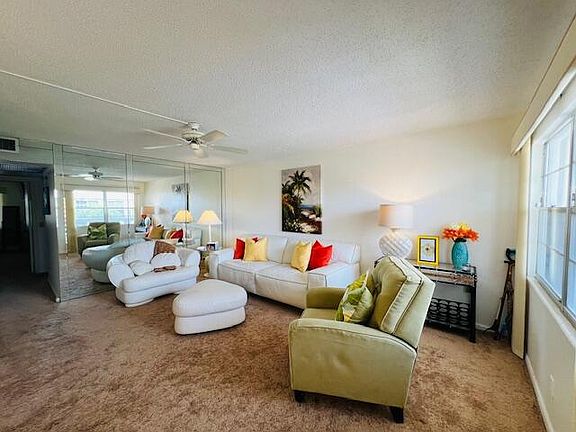 Bring your imagination to create your own custom space. This two-bedroom, one-and-a-half bathroom unit features a large enclosed balcony with stunning water views of the lake and a walk-in closet. Situated in Century Village in Boca Raton, a well maintained 55+ community, The building includes an elevator, community laundry, and ample parking. Residents have access to a spacious clubhouse equipped with a state-of-the-art fitness center, theater, art studio, library, indoor and outdoor pools, 12 tennis courts, shuffleboard, pickleball, bocce, billiards, satellite pools, and free shuttle buses. HOA amenities include assigned parking, internet, basic cable, and water. AC 2014, water heater 2005.