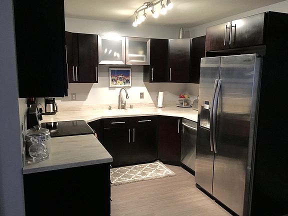 This upscale condo in west Anchorage offers a great location, a unit in excellent condition making this a great value! Unit is loaded with upgrades: Complete kitchen remodel in 2013 with cherry cabinets and Corian counters with an integrated large kitchen sink complete with a Moen touchless faucet. Soft close kitchen cabinets and drawers with custom extras: silverware drawer, trash bin drawer and spice rack pull out. Four lazy susans added in the corners to maximize the storage capacity. All new Samsung stainless steel kitchen appliances installed in 2013. Living room, kitchen and dining area have new dark wood grain laminate. Living room has built in recessed TV area and a gas assisted wood burning fireplace. Travertine flooring on the stairs and in the bonus area upstairs. Bonus area between the two bedrooms is great as an office, workout area or sitting room. Master bedroom with vaulted ceilings, private bath and walk in closet. Second bedroom has a full size murphy bed that was installed in 2014. Oversized two car garage with workbench and custom built in shelving for lots of storage. Crawl space access inside the home allows for more safe and dry storage. Large TREX deck with privacy fence is a great area for summer flowers and enjoying the long days. Condo is close to greenbelt and only a one mile walk to Earthquake Park. Strong home owners association with all reserves intact. Dues include water, sewer, basic GCI cable, gutter maintenance, all lawn care and snow removal. Home owners association allows up to two pets per condo with no weight restrictions. Great townhouse community of friendly neighbors.