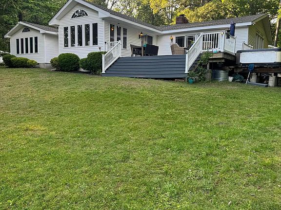 Experience waterfront living at its finest in this exquisite home nestled on the shores of Leonard Mill Pond. Situated on nearly 1 acre of pristine paradise, this property offers unparalleled tranquility and natural beauty. As you approach, be greeted by a stone circular driveway leading to a 2-car detached garage, while decorative pavers guide you to the inviting front porch where the whispers of Mother Nature beckon. Step inside to a grand foyer featuring hardwood flooring and a cozy fireplace, setting the tone for the marvelous open floor plan design. The kitchen boasts tile floors, stainless steel appliances, a center island with a high counter for bar stool dining, and abundant wood cabinetry. Adjacent to the kitchen, a large sunroom bathes in natural light from huge windows, offering stunning views of Leonard Mill Pond. Start your day with sunrise vistas and unwind with evening serenity. The expansive living room features hardwood flooring, ample lighting, ceiling fans, and a sliding door leading to your outdoor oasis. Step onto the 24x21 deck with vinyl railing and revel in breathtaking water views day and night. Indulge in outdoor entertainment with a hot tub, fire pit, private dock for fishing, and opportunities for canoeing or bass boat cruising. Three bedrooms and 2 bathrooms are located on the opposite side of the house, offering privacy and scenic views of the pond, especially from the master bedroom. Don't miss this rare opportunity to make this waterfront retreat your own. Schedule your tour today as this gem won't last long!