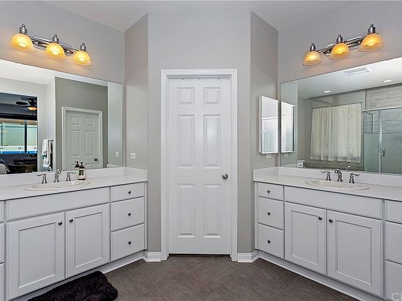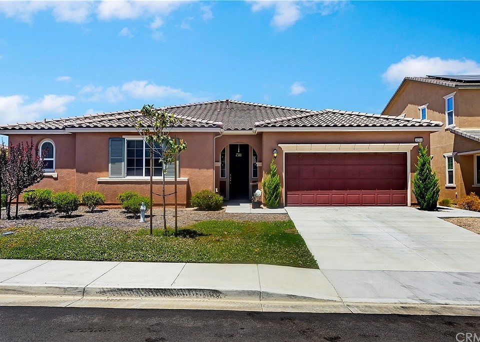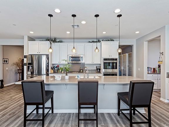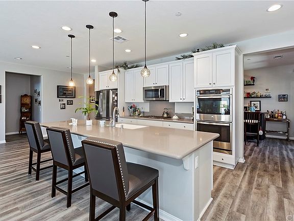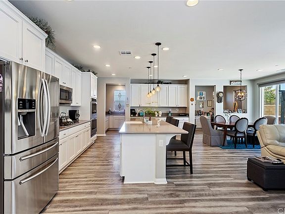 Don't miss out on this opportunity to own a gorgeous single-story home in the highly coveted Spencer's Crossing Community in Murrieta! This home has it all: amazing interior, great school district, designer vinyl flooring & a spacious floor plan. The grand entry foyer guides you into a den/dining room with large, glass doors open to the side yard patio which is perfect for hosting gatherings. This home has your dream kitchen and it features quartz countertops, all stainless steel appliances, a double oven, huge island, farmhouse sink, plenty of cabinetry for storage, built-in range, countertop bar seating, stylish pendant lighting, & a large butler's pantry complete with a sink. The kitchen flows into an eating area which is accented with a modern light fixture and leads to an office nook complete with a built-in double desk. The kitchen is open to the family room which highlights the cozy gas fireplace. The double sliding glass doors and plentiful windows offer lots of natural light and have sleek, pull-down shades. The master suite has a large bedroom, and the bathroom features his & hers vanities, upgraded tile, soaking tub, walk-in shower, and walk-in closet. The other 2 bedrooms are adjoined by a Jack & Jill bathroom complete with double sinks, storage, and a walk-in shower. The backyard has a gated side yard with a covered patio, above-ground pool, firepit, & spa. Not only is this home beautiful and enormous, but it is also close to Spencer's Crossing Sports Park and is just minutes from groceries, restaurants, and top-rated schools.