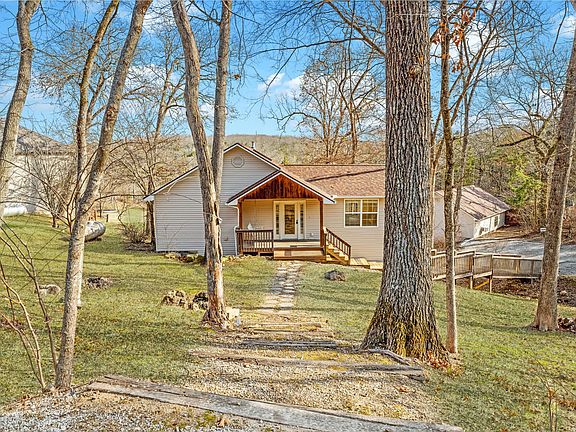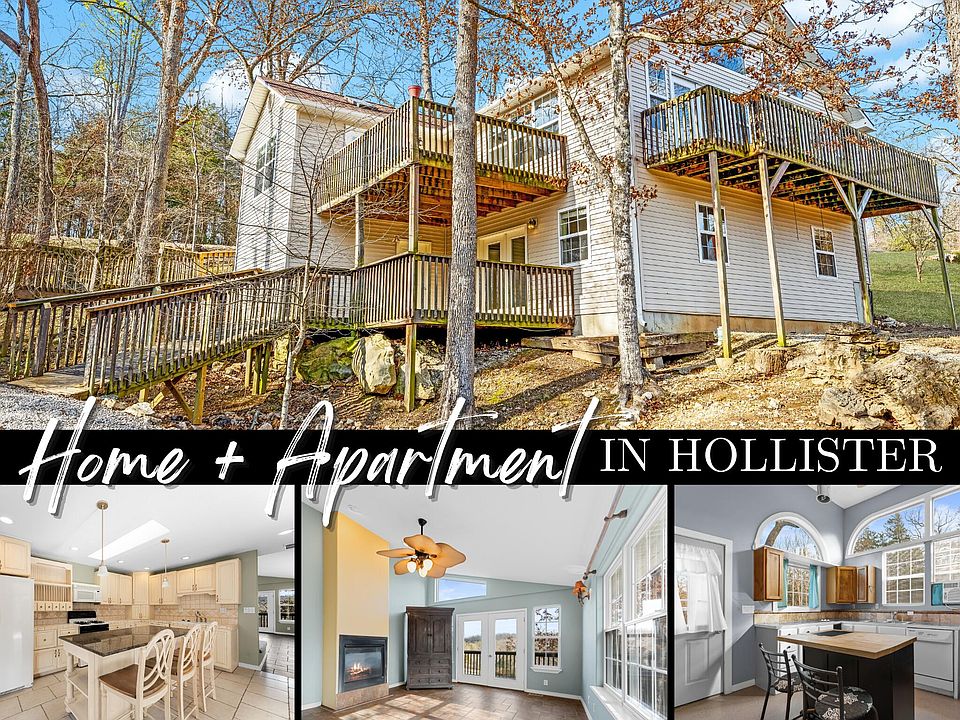 This unique property on over an acre in Hollister, MO, features a spacious 2-bedroom, 2-bath main home plus an apartment with a garage workshop. The main home boasts vaulted ceilings, a double-sided fireplace between the living room and master bedroom, and French doors leading to a large, private deck perfect for entertaining. The kitchen features granite countertops, tile backsplash, pendant and recessed lighting, a skylight for natural light, and plenty of cabinet storage. The master bedroom offers vaulted ceilings, French door back deck access, and an ensuite bathroom with a walk-in shower, oversized jetted jacuzzi tub, a skylight, and a walk-in closet with an attached laundry room. The lower level includes a spacious rec room, an additional bedroom, a private bath with a tub-shower combo, and a large storage room. The 14x25 workshop garage with a 10-foot door includes a fully equipped studio apartment, complete with a kitchen, washer/dryer, standing shower, and a private bedroom, perfect for rental income or guest accommodations. Located just minutes from downtown Hollister, this property combines privacy, versatility, and convenience, making it a great home or investment. Enjoy being close to Hollister's charming shops, restaurants, and outdoor activities while remaining just a short drive from Branson's attractions. Check out the 4K home video tour or call to schedule your personal showing today!