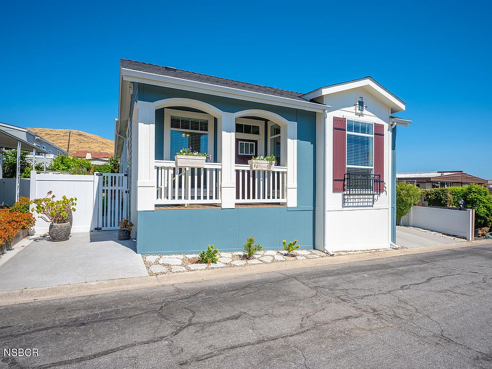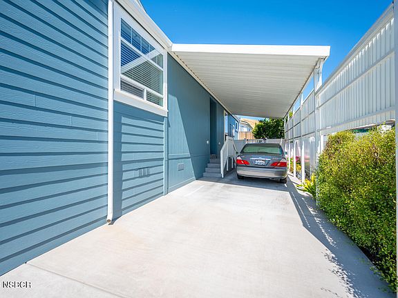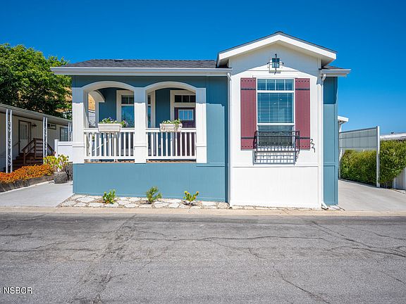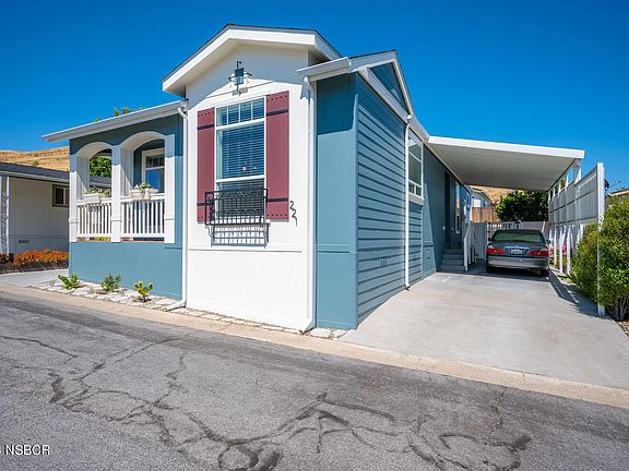Welcome to this 2017 modular home showing tremendous pride of ownership in a 55+ park with amenities. Big pluses: You own the land, the permanent foundation enables VA and conventional financing, and it is very close to the SLO Public Market and downtown SLO with easy access. It features a welcoming front porch, an open floor plan with tall dual pane windows and beautiful views of SLO hills. The kitchen has spacious white cabinets, a walk-in pantry and Frigidaire stainless steel refrigerator, dishwasher & gas range and the counter bar provides room for two bar stools and lots of storage. The great room continues with a large dining area with north and west lighting, vaulted coved ceilings, tall baseboards, and recessed cam lighting throughout. There is Congoleum vinyl flooring in 'rustic wood' in the kitchen, dining room, hallway and bathrooms with light pearl gray carpeting in bedrooms and living room. The large master suite offers double sinks, separate toilet room, walk-in shower, and spacious walk-in closet and the master bedroom opens directly to low-maintenance private back patio. The guest bedroom is also ensuite offering privacy for your guests. The third bedroom with a closet could serve as an office or art room. Landscaped areas are fully drip-irrigated including the front with newly landscaped tumbled granite flagstones. For potted plants, two commercial rain barrels catch water or use when the drip system is not needed. The Life Source water condi- tioning system is included. The pomelo and orange trees produce awesome organic fruit. A white vinyl fence surrounds the home and the extra-long and high carport facilitates a vehicle up to 10'3" tall and 8' wide plus second vehicle. The exterior of the home and the high-end shed were painted in May of 2022 and this home has been protected by termite/ant quarterly service during the past five years.