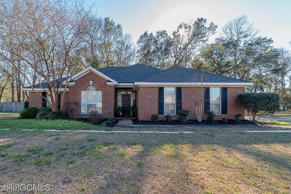 This beautiful brick 3 bedroom 2.5 bath home is located in the sought out west mobile neighborhood of Branson Park. It speaks pride of ownership throughout. As you walk through the front door and step upon the Foyer tile hardwood floors, you will feel right at home. This home has an open and airy feel to it, and is very inviting. The half Bath is located near the Kitchen. The Family Room has a vaulted ceiling, gas-log Fireplace, wired for surround sound and wonderful views of the backyard. The separate Dining Room opens into the Family Room and where you can see into the Kitchen. The Kitchen features new stainless steel appliances, Center Island with butcher block counter top, track lighting and ceramic tile back splash. The Breakfast Room is situated in a Bay window. The Master Bedroom is spacious with tray ceiling an ensuite bath that features new fixtures with tub and mirror accented with tile for that little something extra. No need for visitors to trample through the Laundry Room because it is located at the back of the house and has a private door into the backyard. Speaking of backyard...this yard is nearly an acre with privacy fencing all around. Enjoy relaxing on this wonderful open deck and taking in the quiet country atmosphere. This home has been meticulously taken care of and freshly painted and in MOVE-IN condition. A couple items to draw your attention to, New fixtures, guest bathroom remodeled, Kitchen was remodeled in 2020 and new roof with new plywood was installed 2021. Call for your appointment today. All updates per the seller. Listing company makes no representation as to accuracy of square footage.